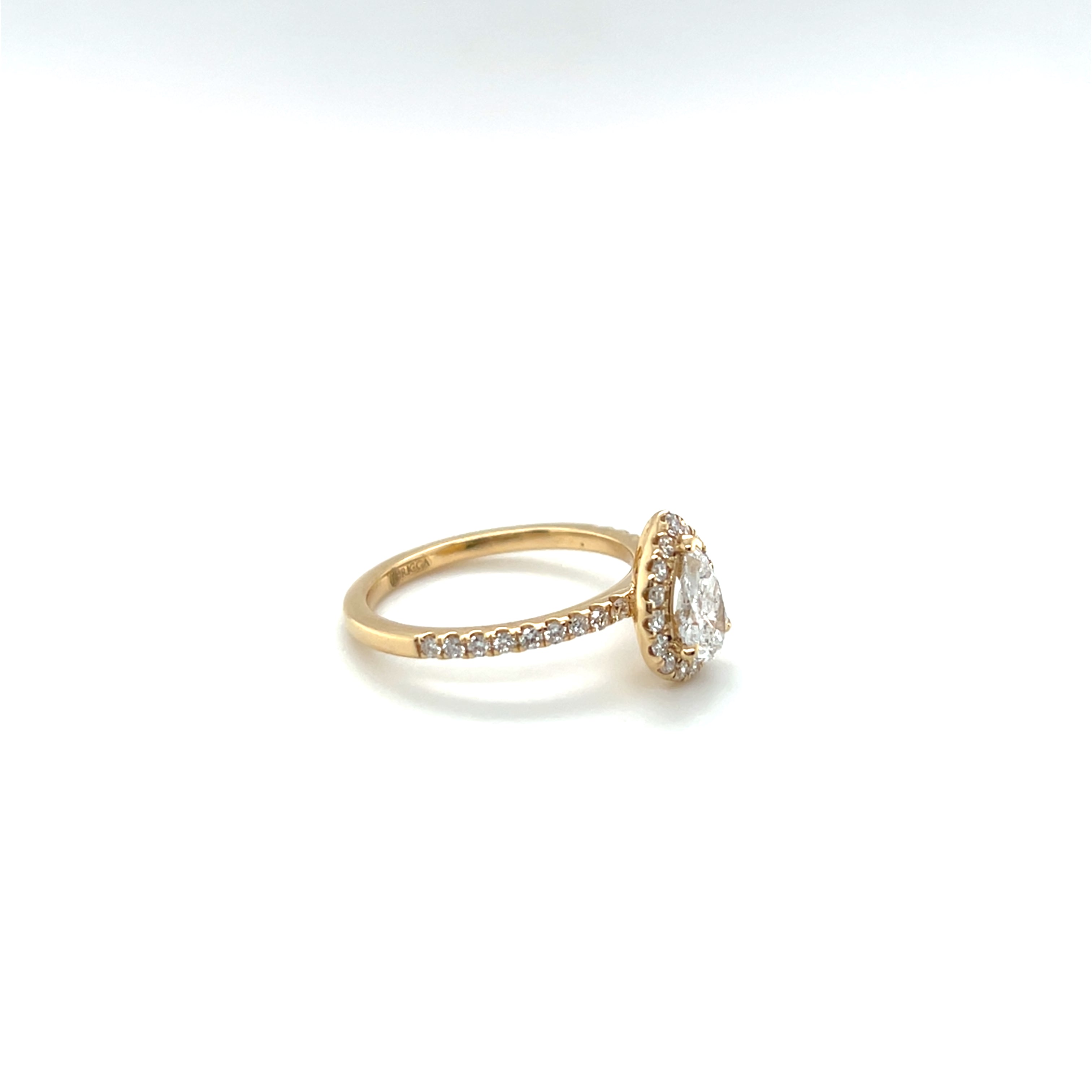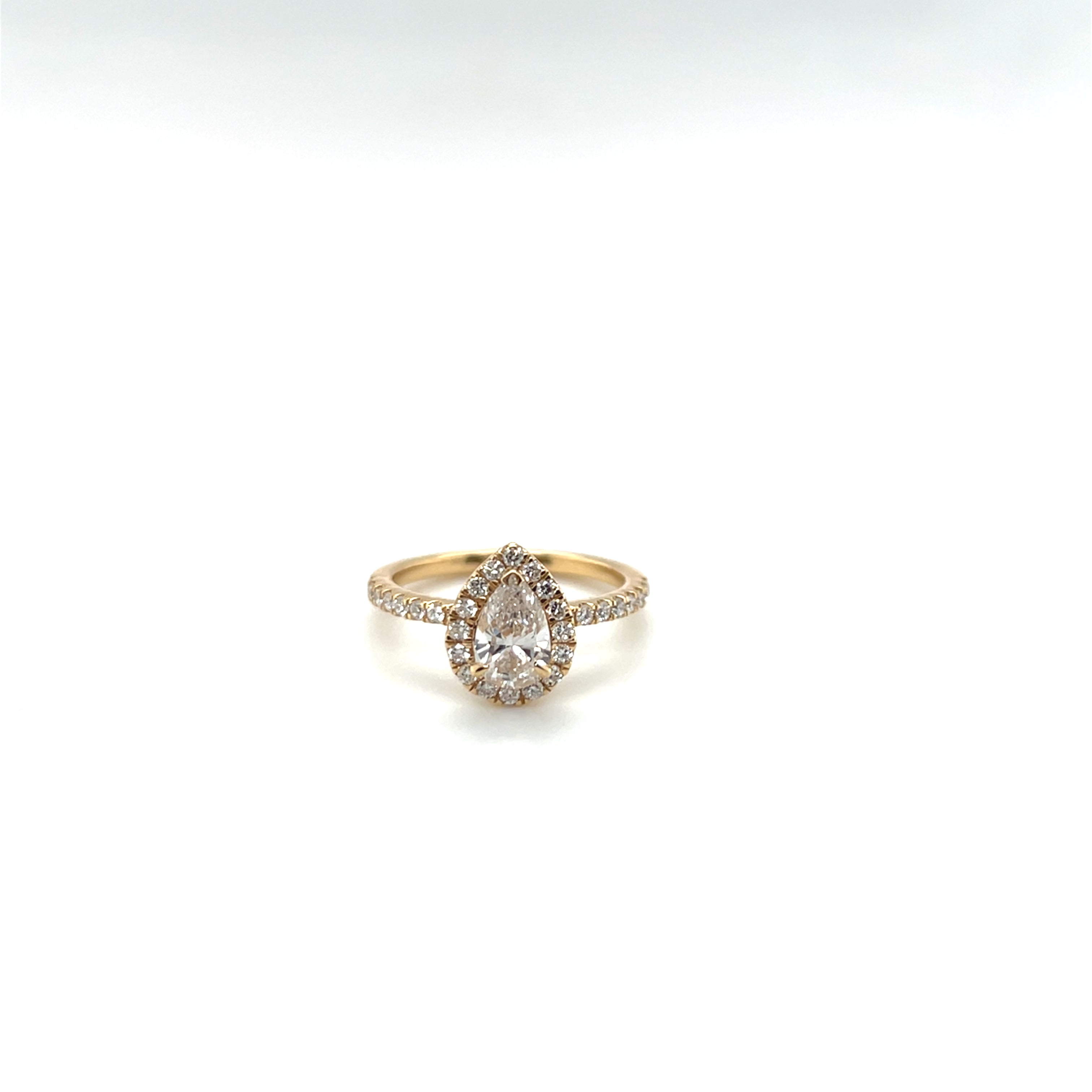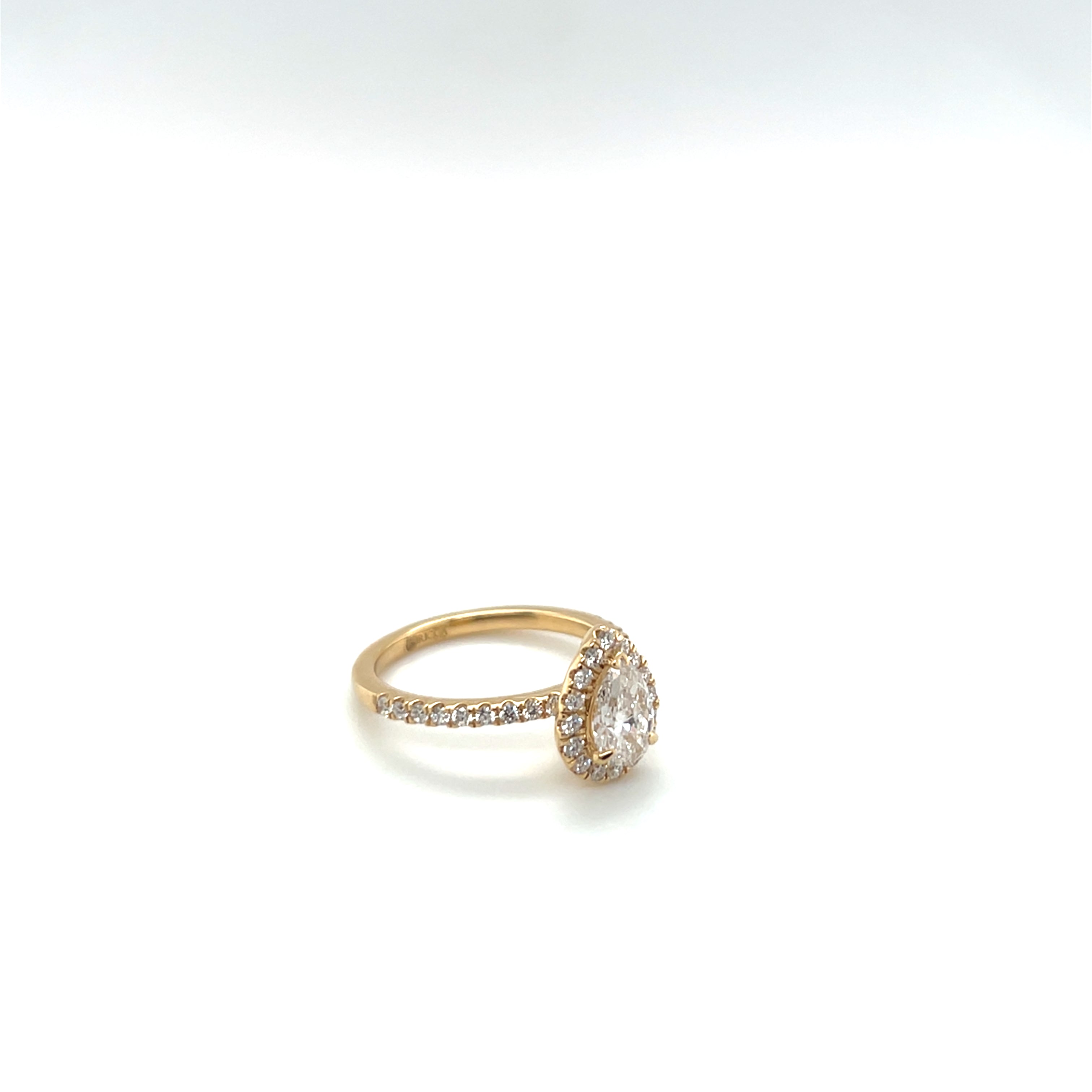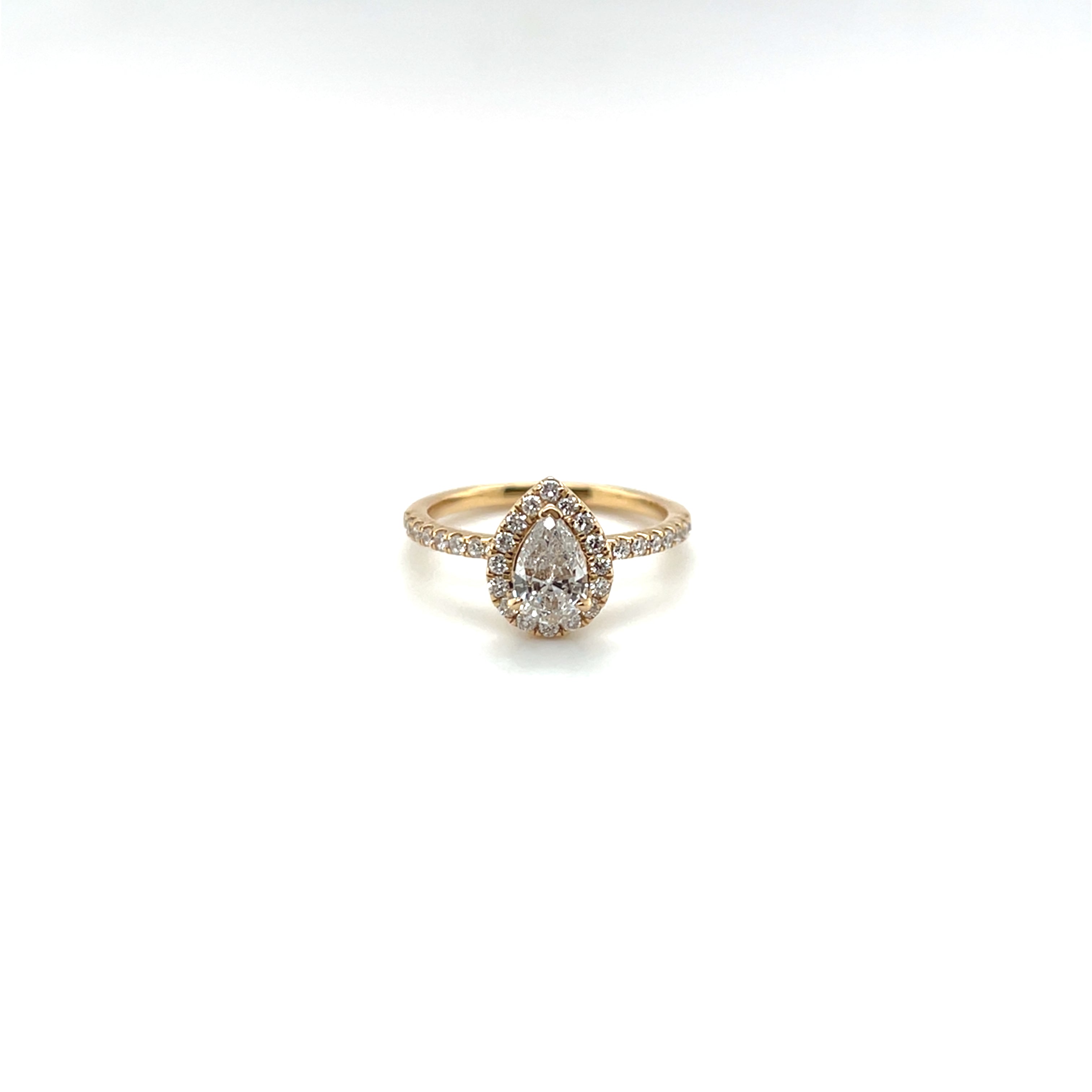 Striking and graceful, this 18k gold halo ring features a sustainably sourced pear-cut diamond at its center an elegant 0.52-carat or 0.59-carat stone, depending on size.