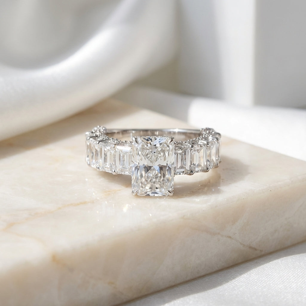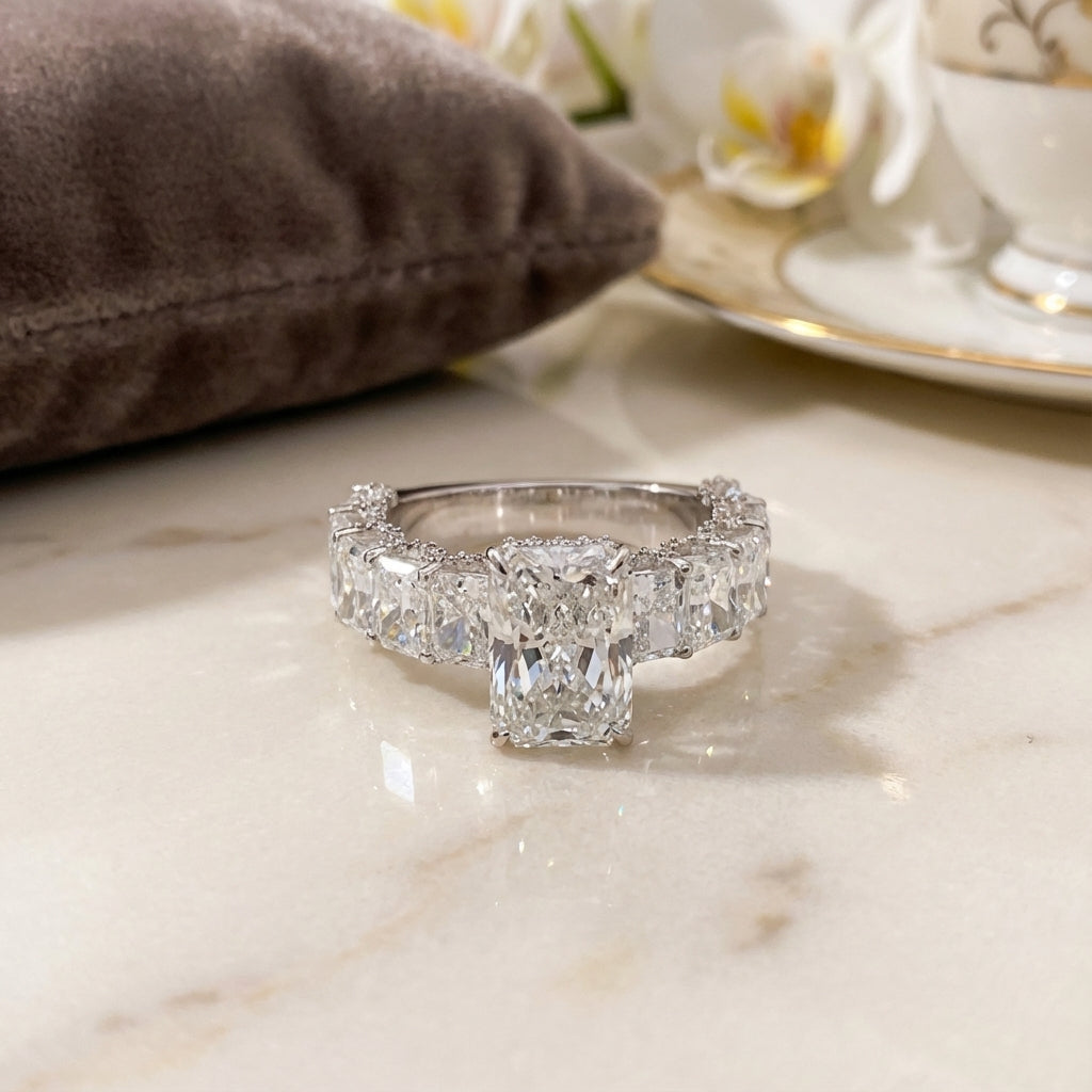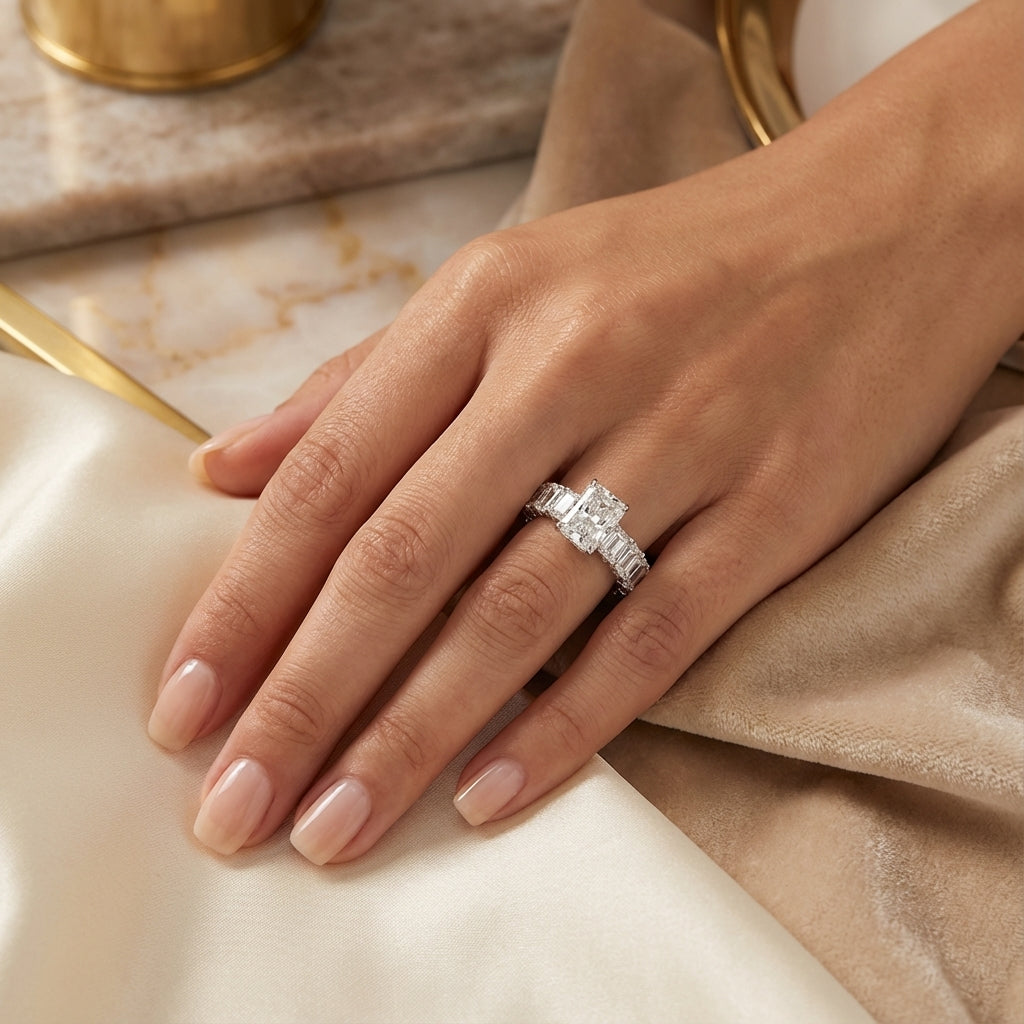Composto por um total de 8,61 ct em diamantes, o anel possui um diamante central de 3,02 ct, complementado por 10 diamantes ao longo do aro totalizando 5,13 ct.