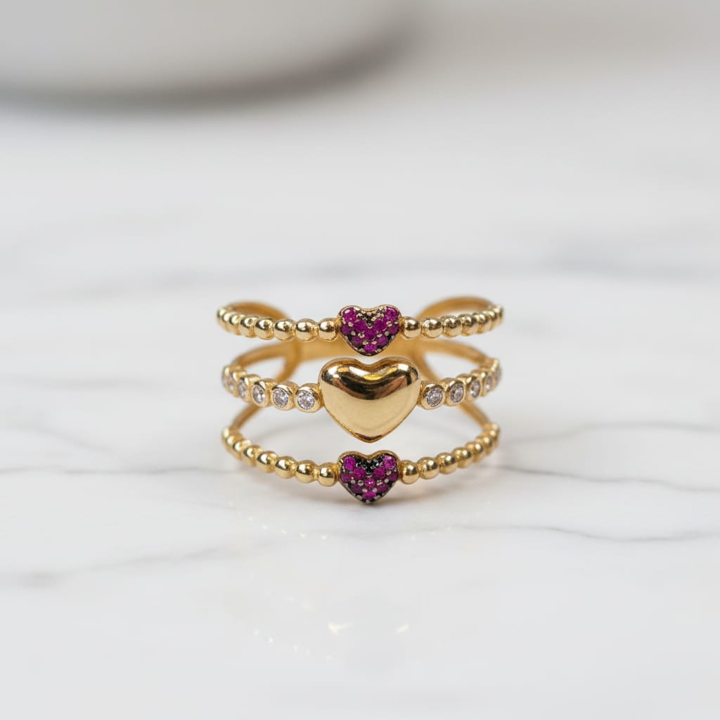 Este anel único apresenta uma composição tripla de aros, cada um com um coração delicadamente posicionado no centro, simbolizando o amor em suas diversas formas.