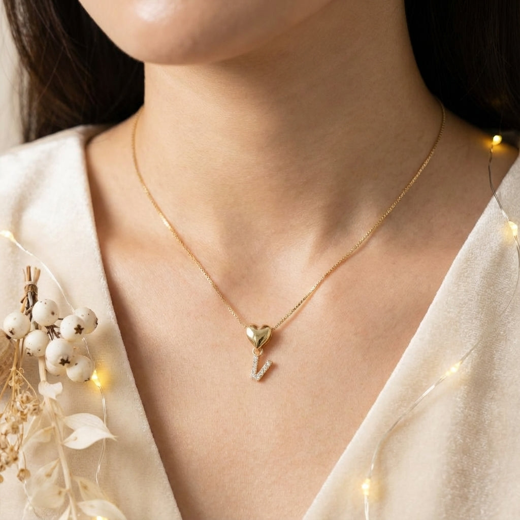 - Pingente : em formato de coração com inicial personalizada e diamantes de lapidação brilhante.