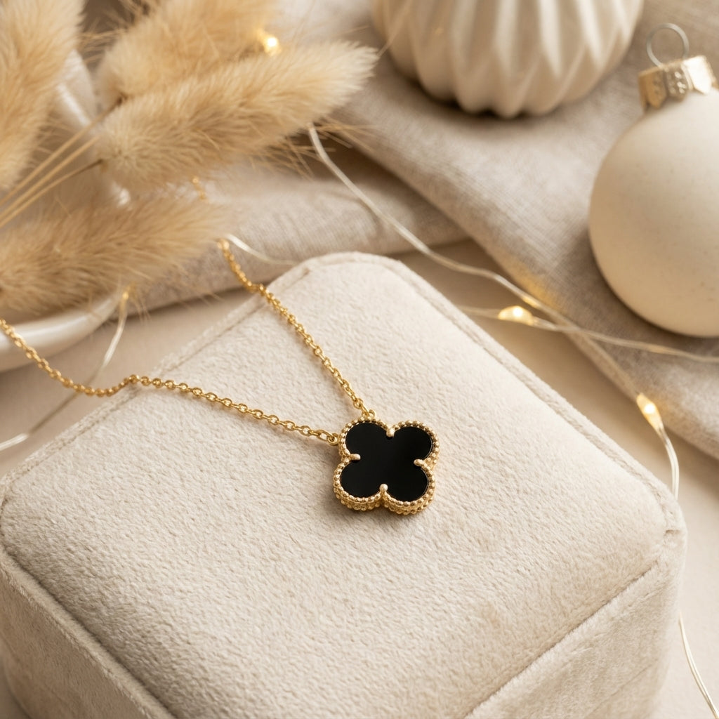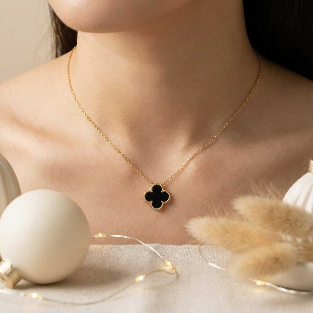 Its adjustable length—from 50 cm to 45 cm or 45 cm to 40 cm—offers versatile styling, whether worn close to the neckline for formal evenings or layered casually during the day. The delicate 10 mm pendant harmoniously blends the deep mystique of onyx, known for its protective qualities, with the iridescent beauty of mother-of-pearl, symbolizing purity and transformation.