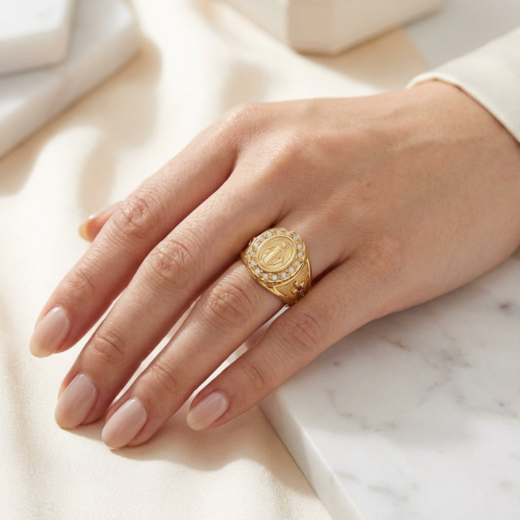 Discover celestial beauty with our 18k Gold Our Lady of Grace Ring, adorned with stunning diamonds.