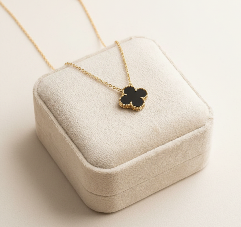Its adjustable length—from 50 cm to 45 cm or 45 cm to 40 cm—offers versatile styling, whether worn close to the neckline for formal evenings or layered casually during the day. The delicate 10 mm pendant harmoniously blends the deep mystique of onyx, known for its protective qualities, with the iridescent beauty of mother-of-pearl, symbolizing purity and transformation.
