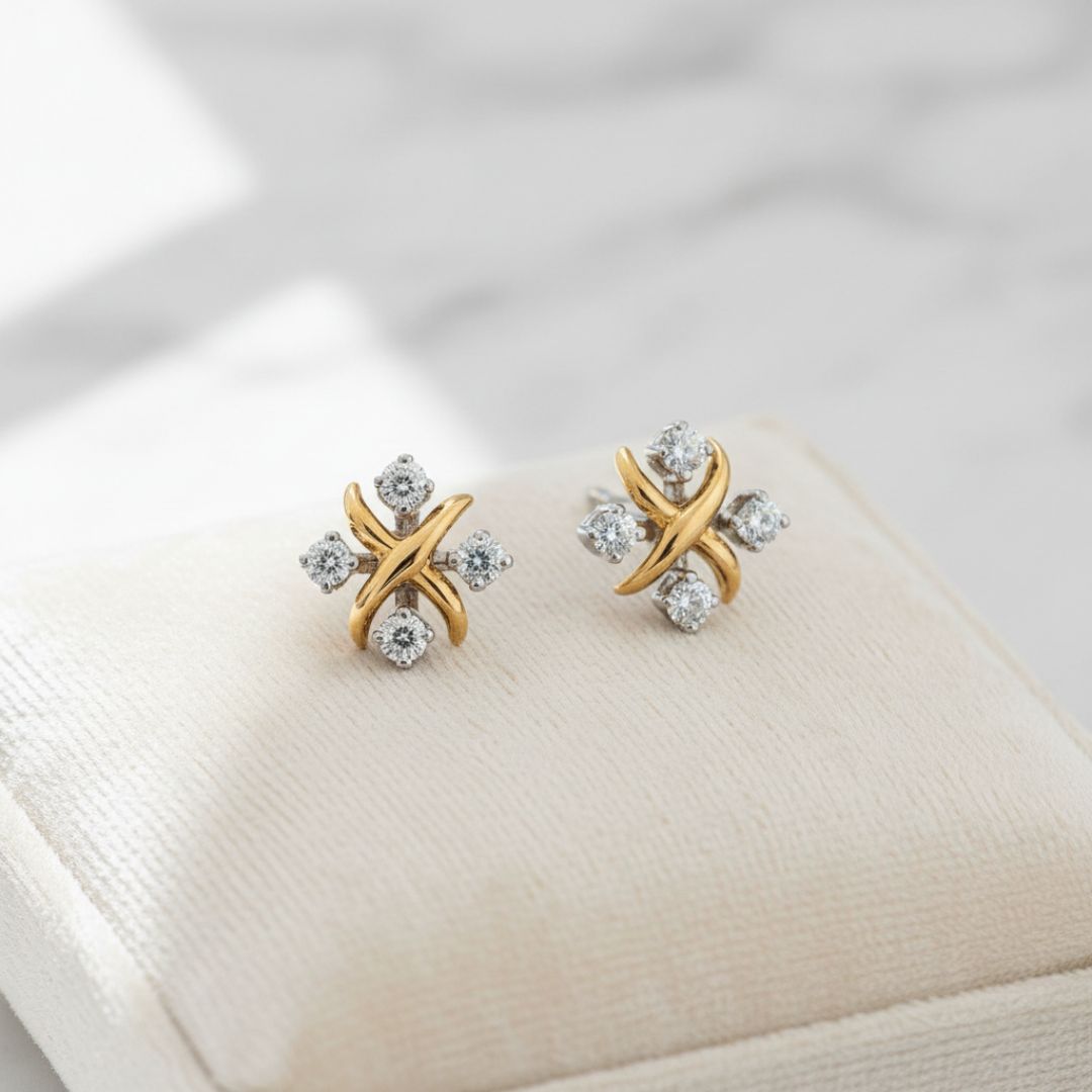 Cada pendiente presenta cuatro diamantes naturales engastados individualmente, dispuestos simétricamente (dos verticalmente y dos horizontalmente), creando una forma refinada y estilizada que irradia sutil sofisticación y equilibrio.
