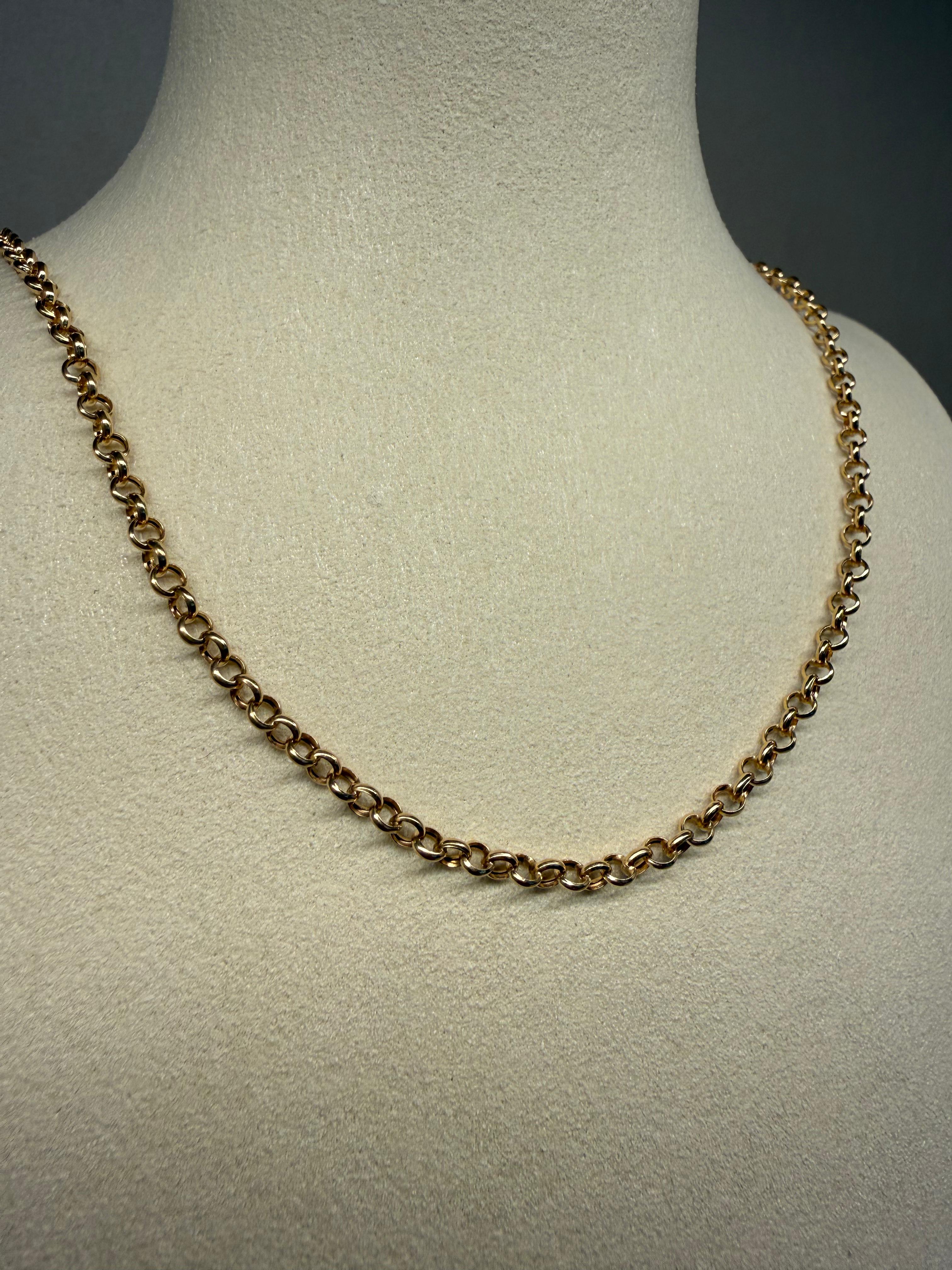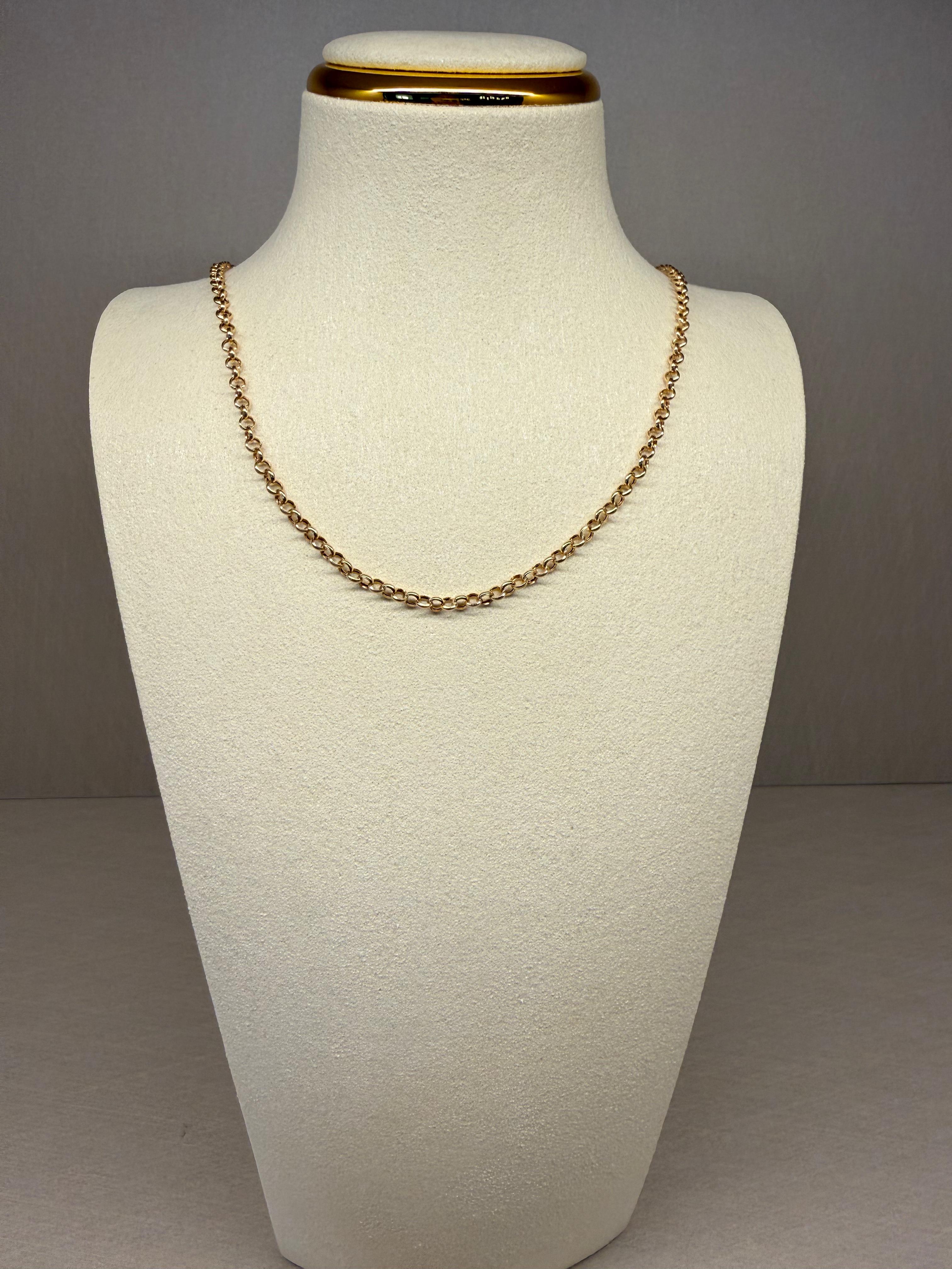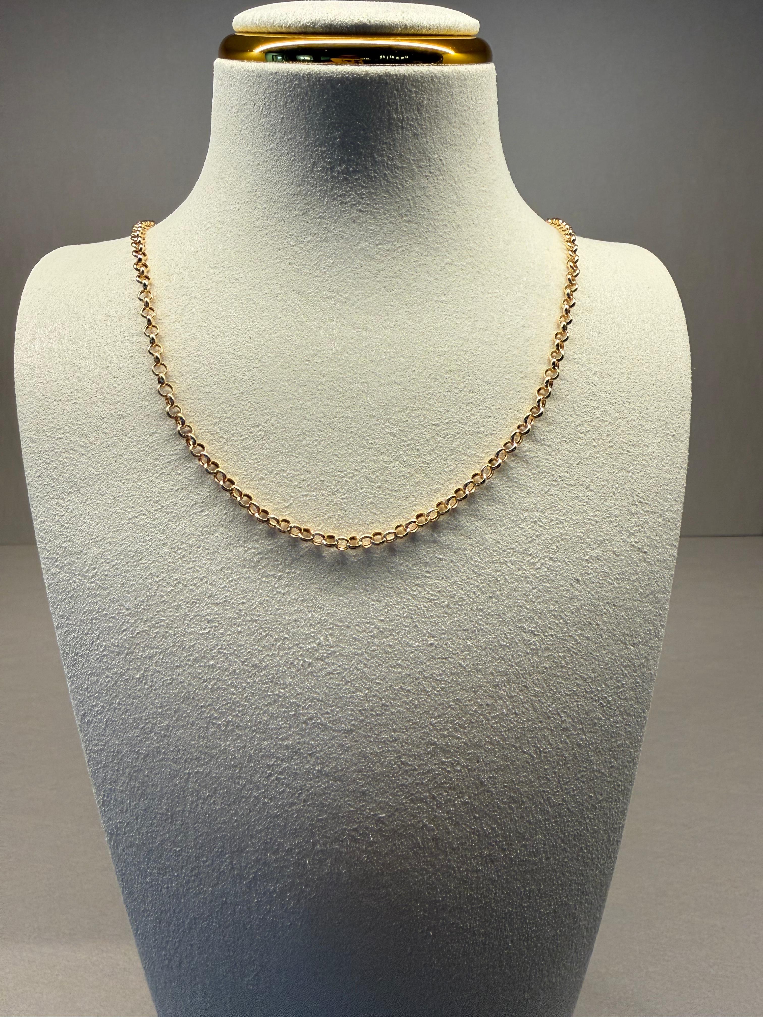 Elaborada en radiante oro de 18k, esta cadena de 40 cm presenta elegantes eslabones redondos en el clásico estilo portugués, un diseño atemporal celebrado por su refinada simetría y versatilidad.