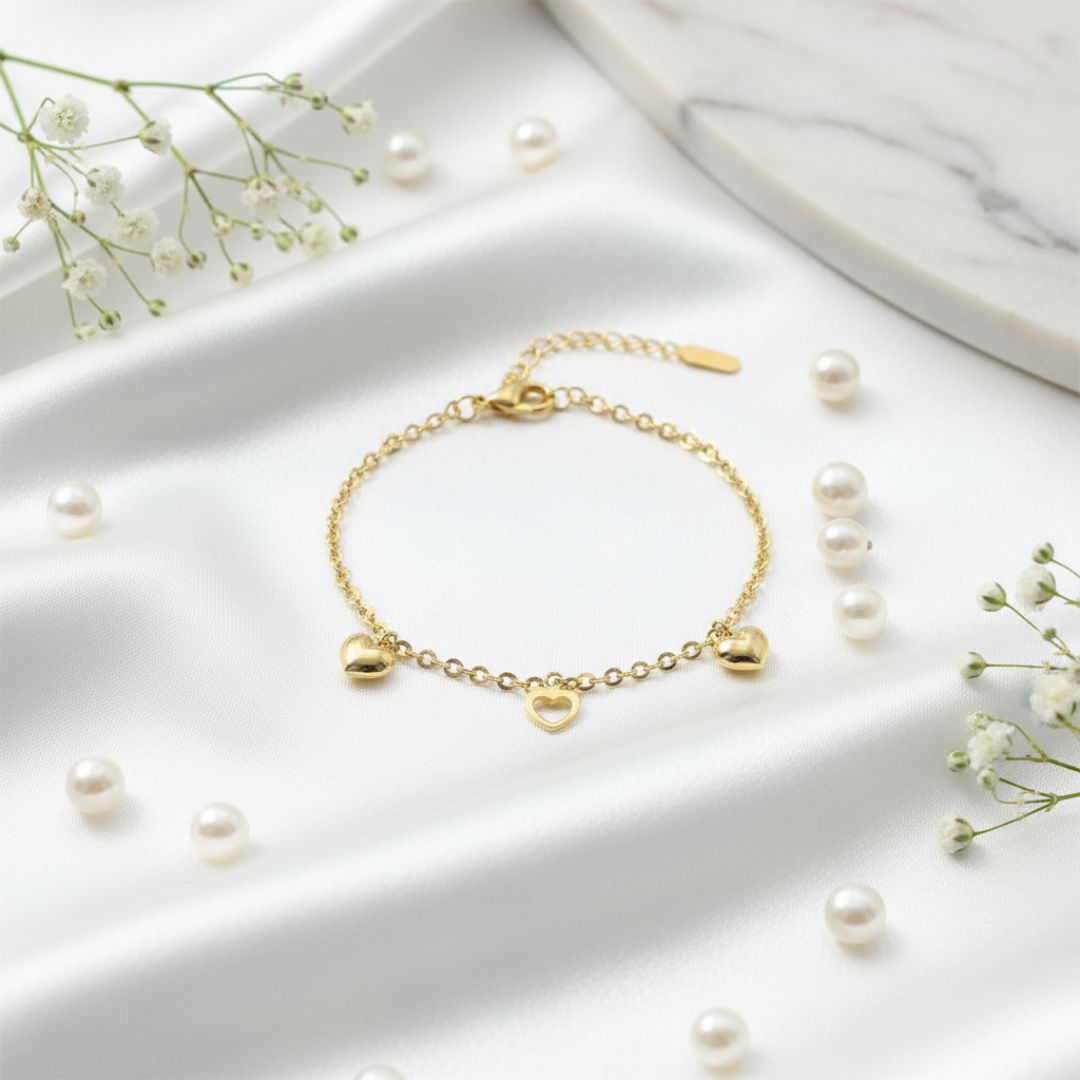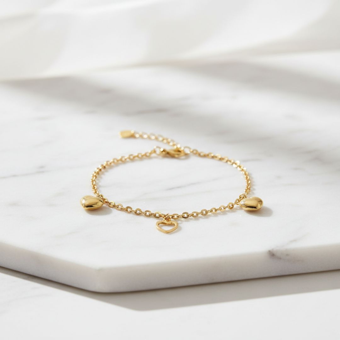Presentamos la encantadora pulsera para niños en oro de 18 quilates, adornada con tres preciosos dijes en forma de corazón que simbolizan el amor y el afecto.