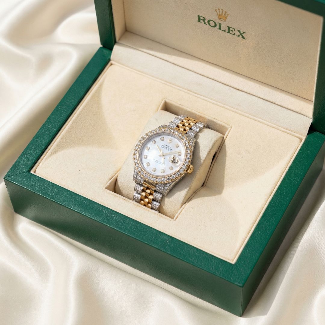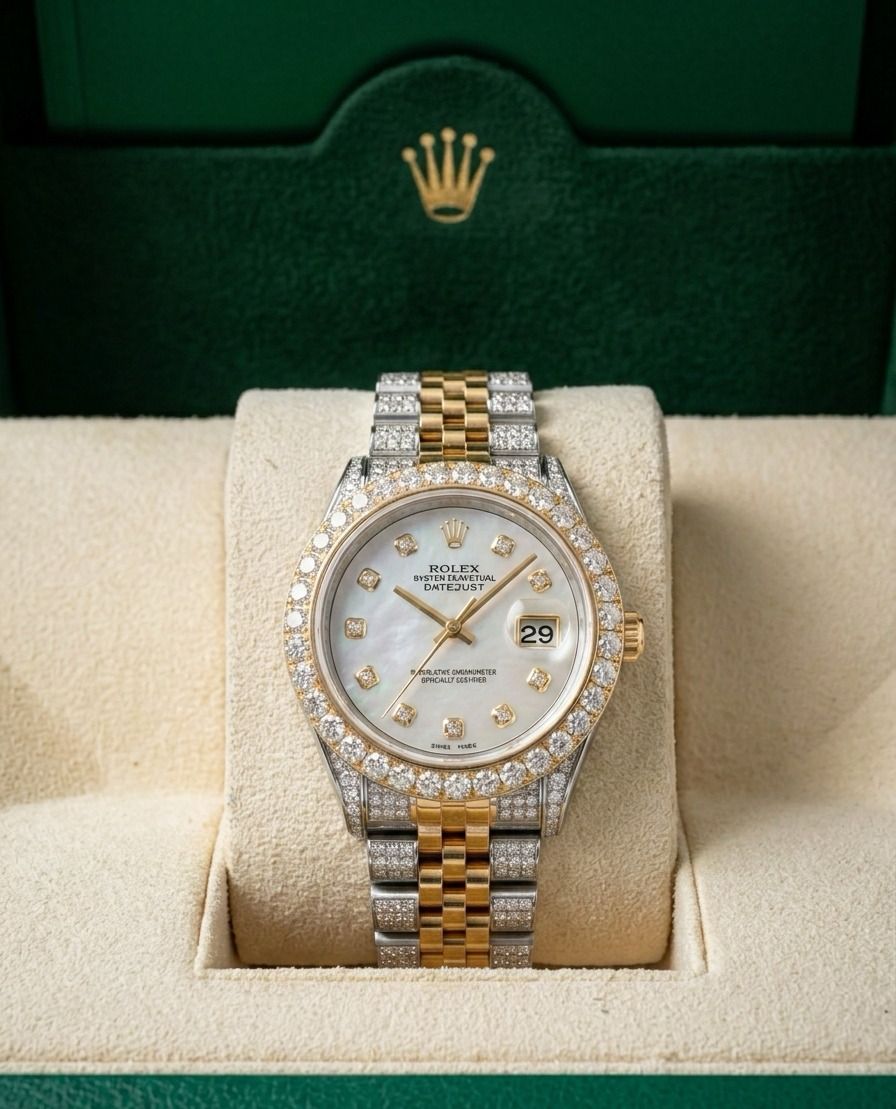 A statement of brilliance and prestige, this 36mm luxury timepiece is designed for women who appreciate exceptional craftsmanship and radiant elegance. Custom enhanced in an “iced-out” style, it features approximately 12 carats of natural round brilliant diamonds, meticulously set to maximize sparkle and presence.