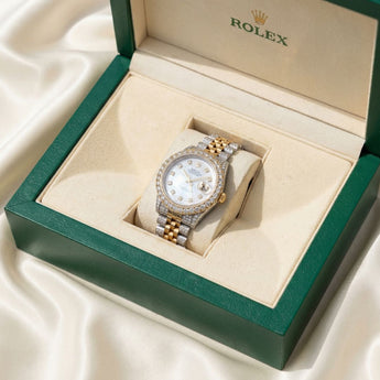 The 36mm case offers a perfectly balanced wrist presence, while the diamond-accented dial enhances its luminous sophistication. The combination of stainless steel and 18K yellow gold creates a refined two-tone aesthetic, further elevated by the diamond-set bezel and bracelet details.