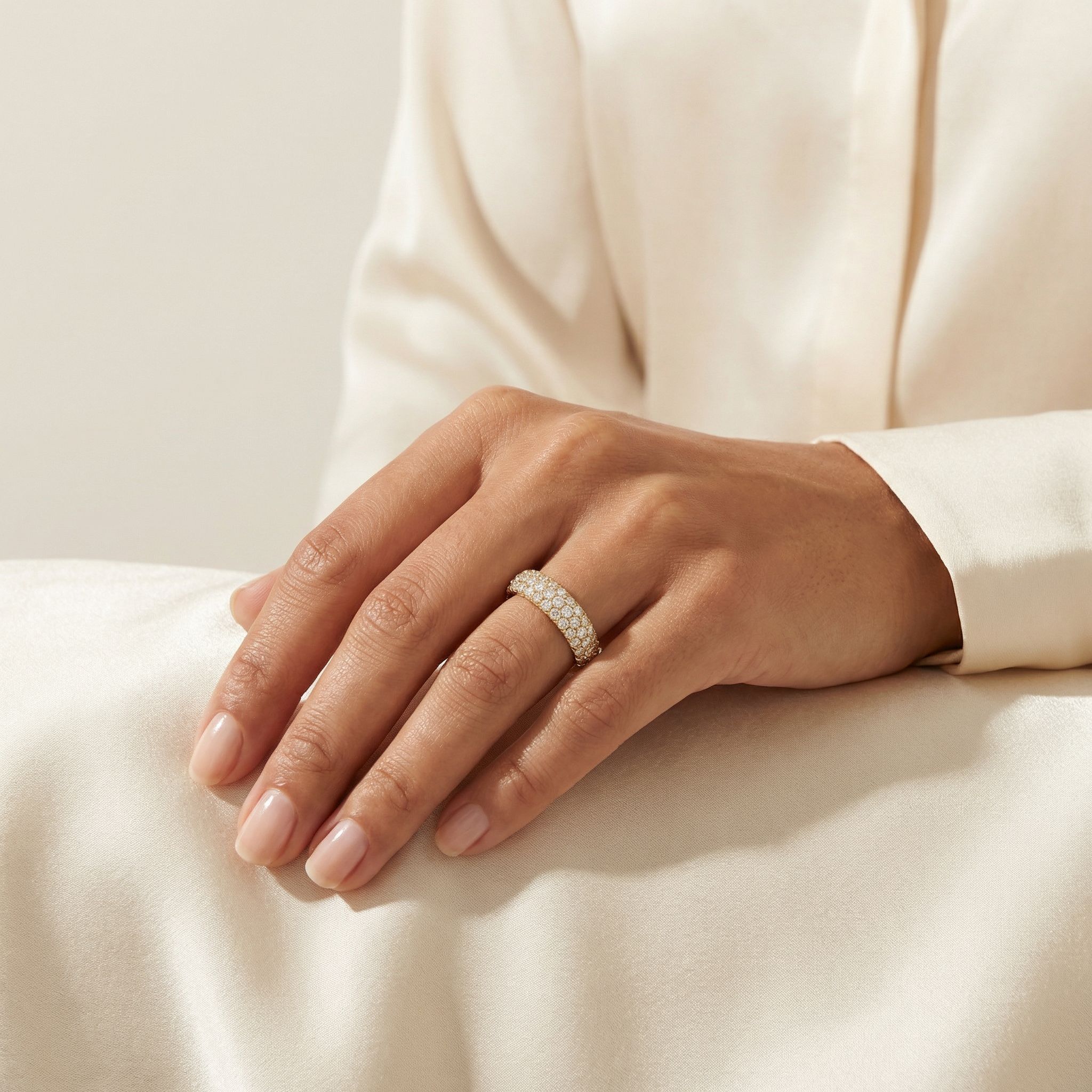 The pavé setting enhances the stones’ radiance, giving the ring a sophisticated and glamorous appearance that complements any style.