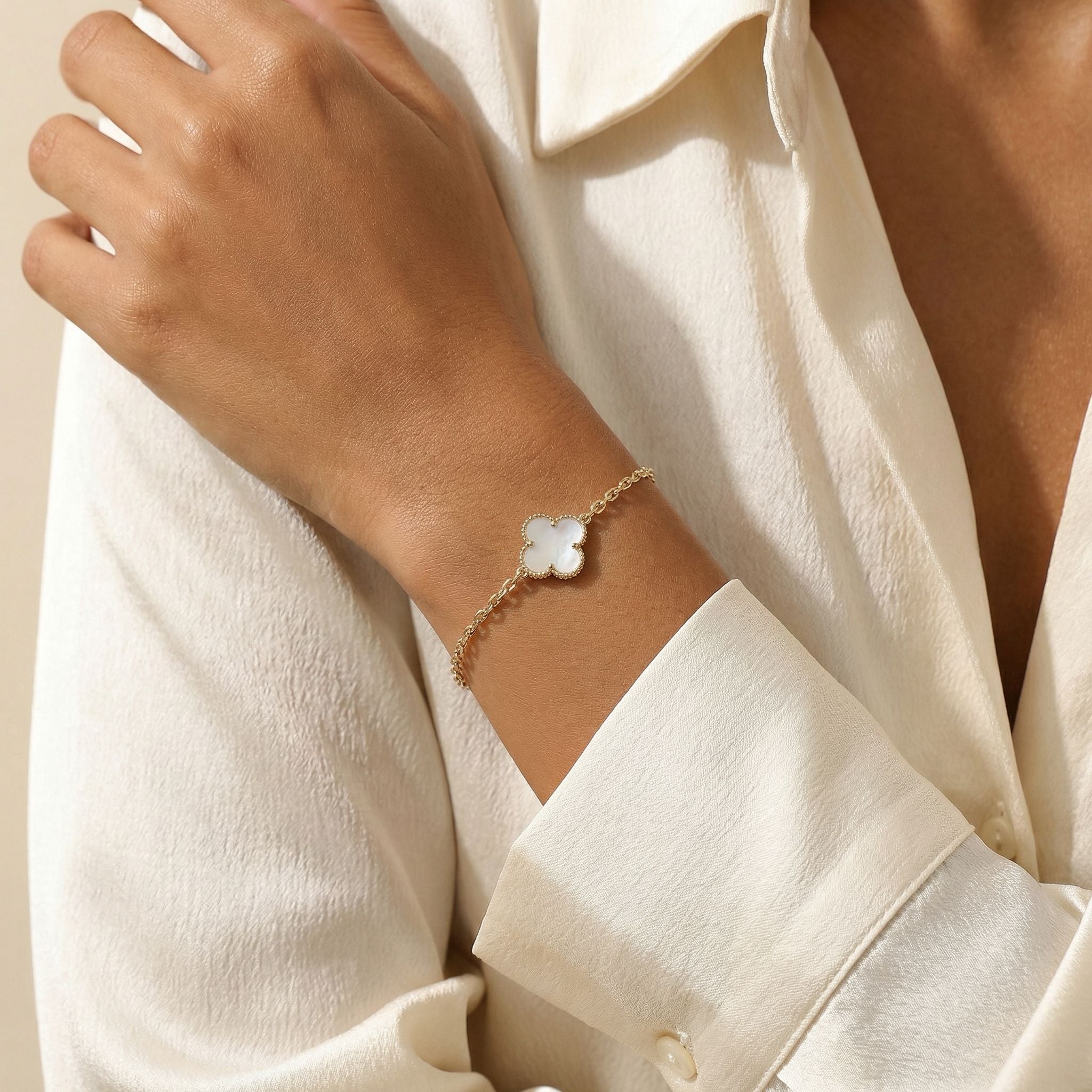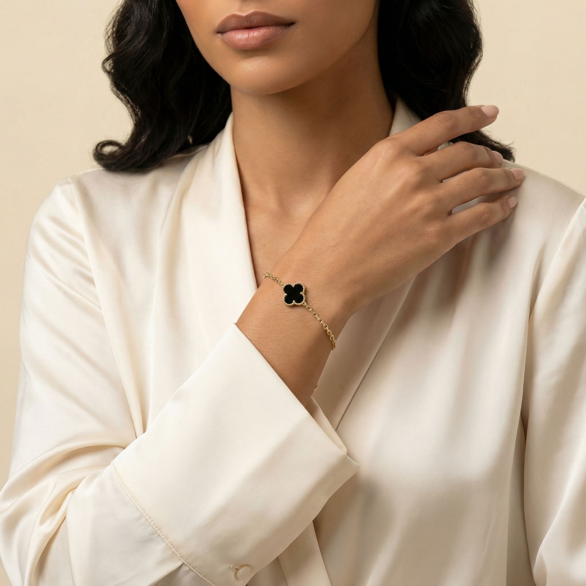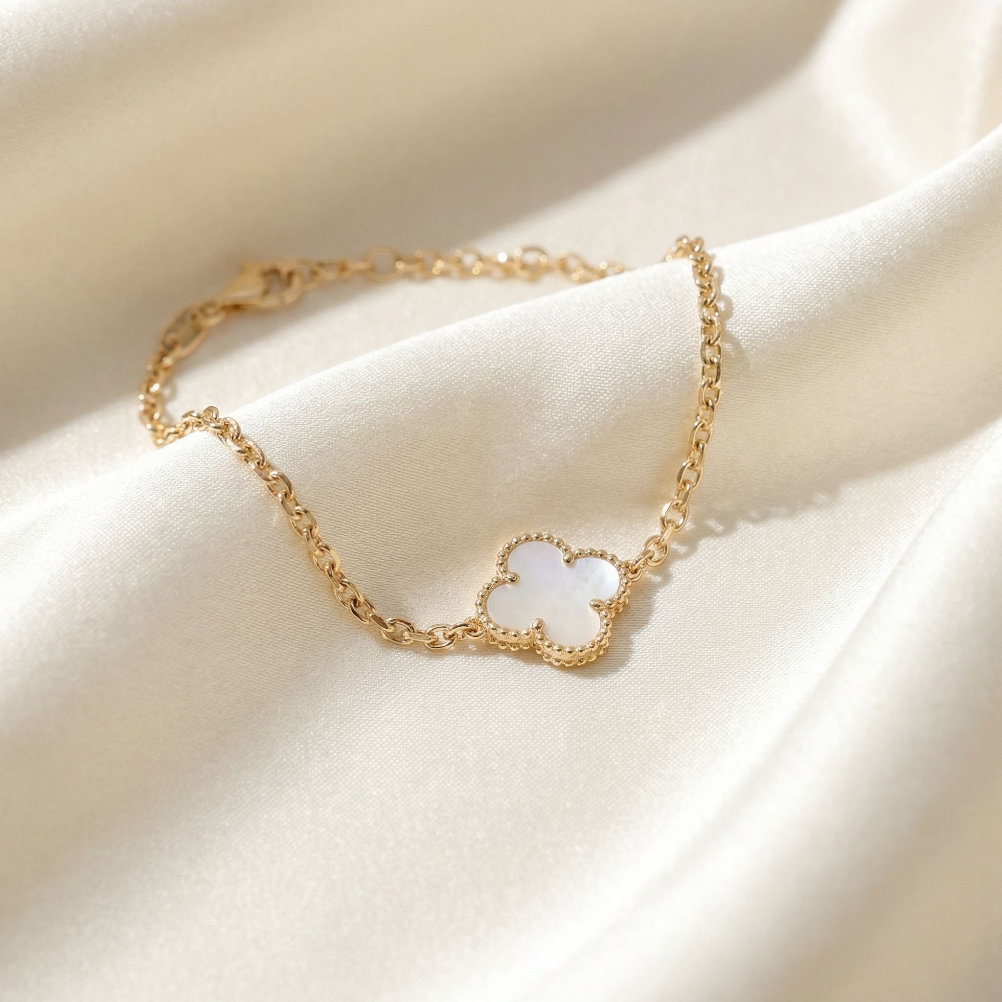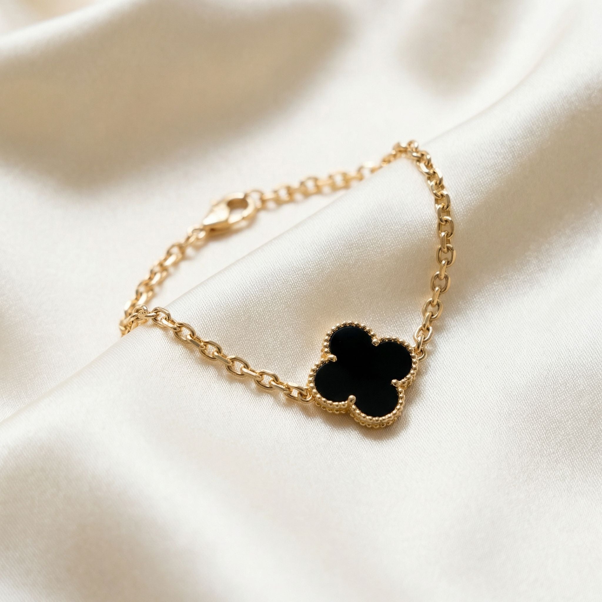 Exiba elegância e charme moderno com esta pulseira com pingente de trevo em ouro 18k, um símbolo de beleza atemporal e boa sorte.