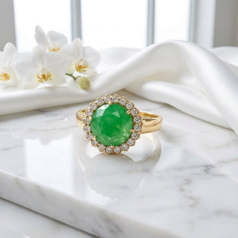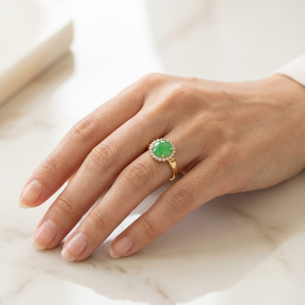 Descubra a beleza atemporal do nosso anel de ouro 18k, que combina harmoniosamente o brilho intenso do ouro com a cor vibrante de uma pedra de jade verde.
