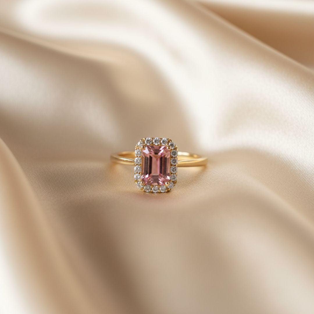 Some colors carry an emotional register that is difficult to articulate but immediate to feel. The natural pink tourmaline at the center of this ring holds that quality — a tone that reads differently in morning light than in candlelight, consistently drawing the eye without announcing itself.