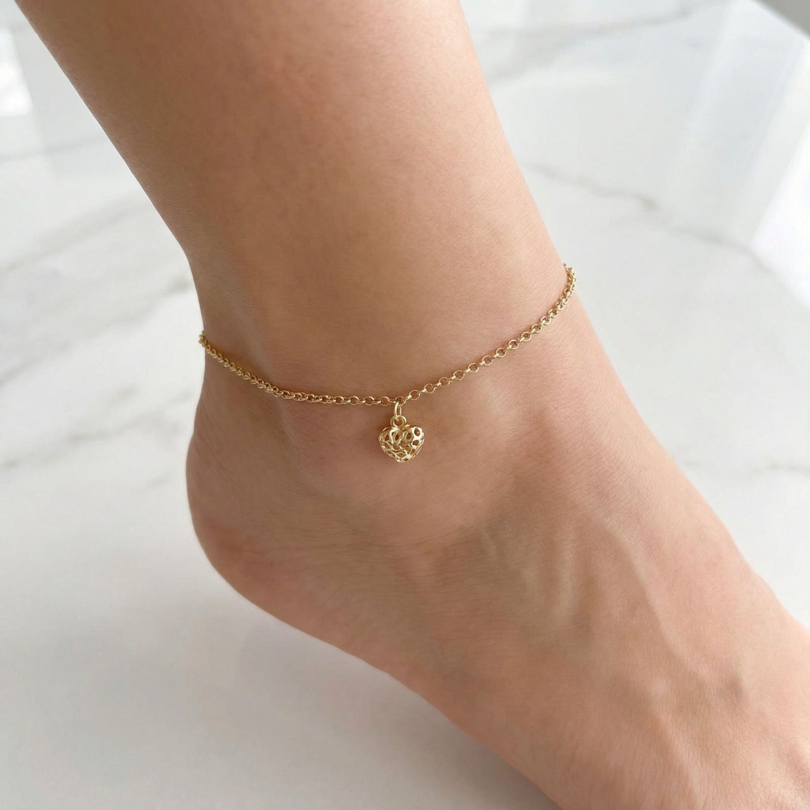 Descubra a moda e o charme da Tornozeleira Elo Português em Ouro 18k, adornada com um delicado pingente de coração.