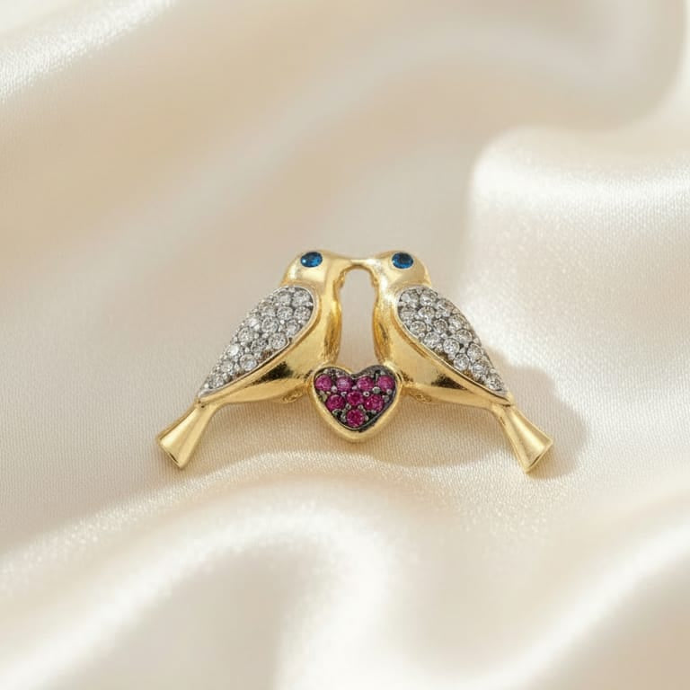 Este pingente único apresenta dois pássaros delicadamente entrelaçados, aproximando-se em um gesto de carinho, dentro de um coração magnificamente cravado com pedras de zircônias cintilantes, simbolizando amor e união.